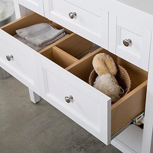 Thick solid white vanity top and decorated with smooth brushed nickel pulls for a sleek and stylish appearance.